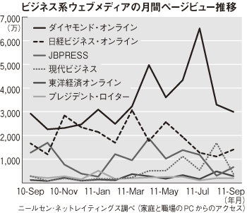 独立系の「JBPRESS」(日本ビジネスプレス、以下JB)も存在感を高めている。PVの変動幅は大きいものの、昨年10月と今年4月にNBOを上回った。同社は、JBの運営とは別に「isMedia」という出版社向けウェブ・プラットフォーム事業も手掛けており、DOLや現代ビジネスもこのシステム上で動いている。さらに、これまでトムソン・ロイターと共同サイトを運営してきた「プレジデント」(プレジデント社)が提携を解消し、12月中に自前サイトを立ち上げるためにisMediaを採用することを決めている。プレジデントが加われば、「isMediaのビジネス系媒体の総PVは7千万を超える」(関係者)とみられ、参加媒体の連携が強まれば新聞社などにとっても脅威だろう。