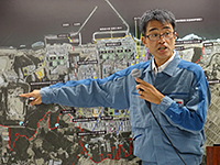 8月8日(土)の正午過ぎ、携帯メールが響く。早朝6時半にイチエフで死亡事故発生。東電本店の臨時記者会見に駆けつける。亡くなったのはいわき市に住む作業員、鳥山直志さん、52歳。1F北の土捨場(どすてば)でバキューム車のタンク内を清掃中に、直径1.8m、重さ0.5tのフタに頭部を挟まれ、即死だった。タンクのフタを閉じるレバーを操作した同僚は、警察の取り調べに「鳥山さんの合図で閉じた」と話しているという。2人が工事車両業務でペアを組んで半年が経つ。当日の作業環境は防護服、全面マスク、ヘルメット、手袋3重(綿手、ゴム手2重)の重装備。全面マスクを被ると視野が狭くなり、声がくぐもり、耳も遠くなる。