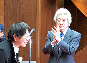 脱原発大賞と自然エネルギー大賞の受賞団体の代表に、賞状を渡して功績を称える小泉純一郎氏