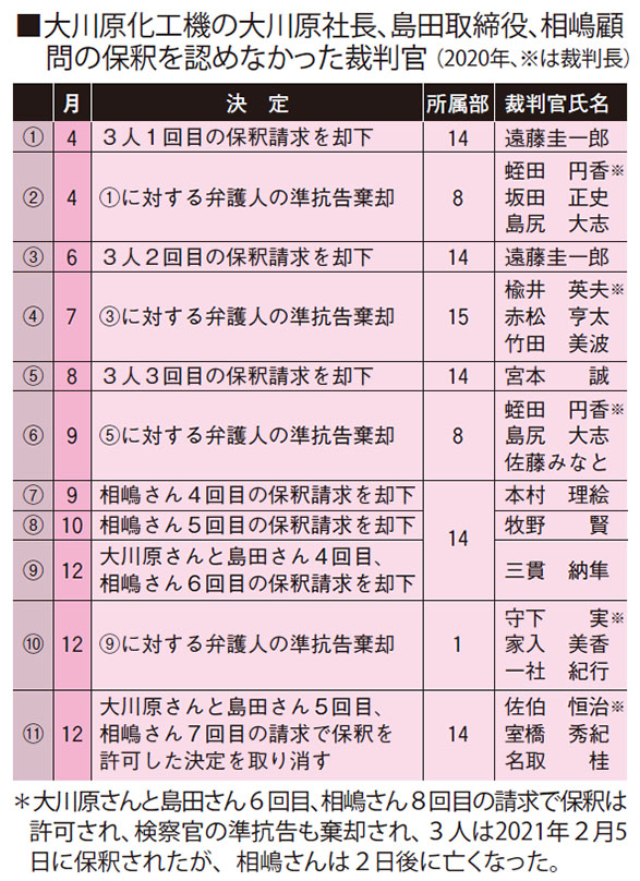 同年12月の大川原さんと島田さん4回目、相嶋さん6回目の保釈請求は14部の三貫納隼裁判官が退け、準抗告も1部の守下実、家入美香、一社紀行各裁判官が棄却したが、5回目と7回目の請求で保釈が許可された。ところが、検察官が準抗告すると、6部の佐伯恒治、室橋秀紀、名取桂各裁判官が罪証隠滅のおそれがあるとして許可を取り消し、3人の保釈を認めなかった裁判官は計18人に上った。