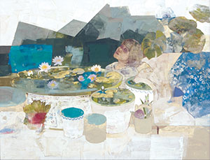 「深い緑の中に見える、水面の光を描きたいと思いました。鮮やかな色と、黄金色の水面の光がはっと心に焼き付いた瞬間を思い出そうと描き始めました。『私の軀、楽園と庭と植物園、明確な境界がないことに気付く。小宇宙にも見える』とは三越の個展で綴った一文ですが、そんなイメージです」