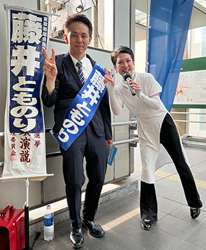 東京都議選の練馬区でトップ当選した藤井とものり氏の応援に駆け付けた蓮舫氏