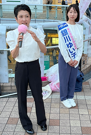 東京都議選の足立区で2度目の当選を果たした銀川ゆい子氏の応援演説に立つ蓮舫氏
